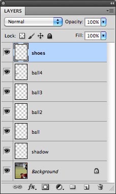 - Nhân bản 4 layer "ball" sắp xếp theo đường nẩy của banh (thành ball2, ball3 và ball4)