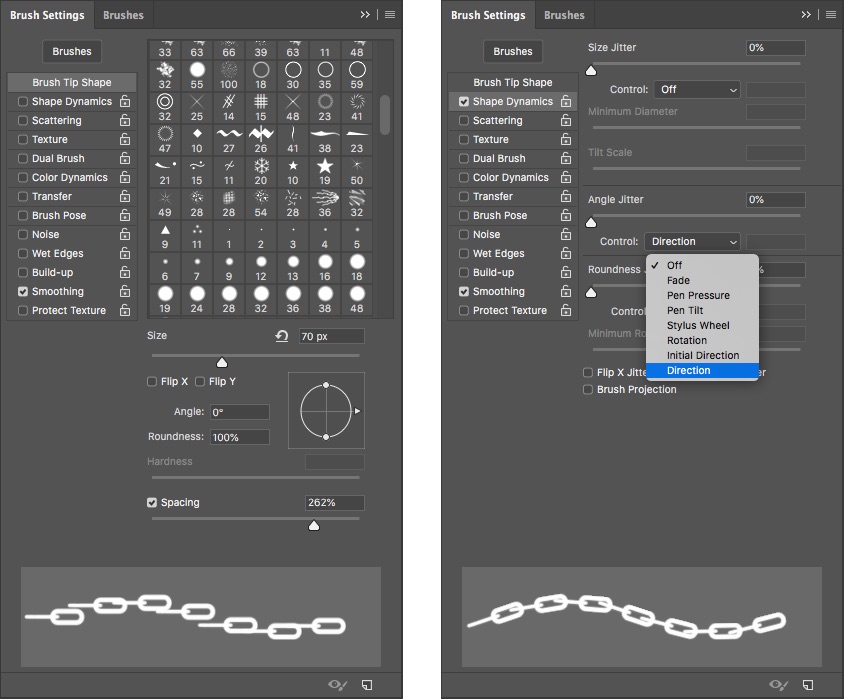 - Shape Dynamics > Angle Jitter > control: Direction