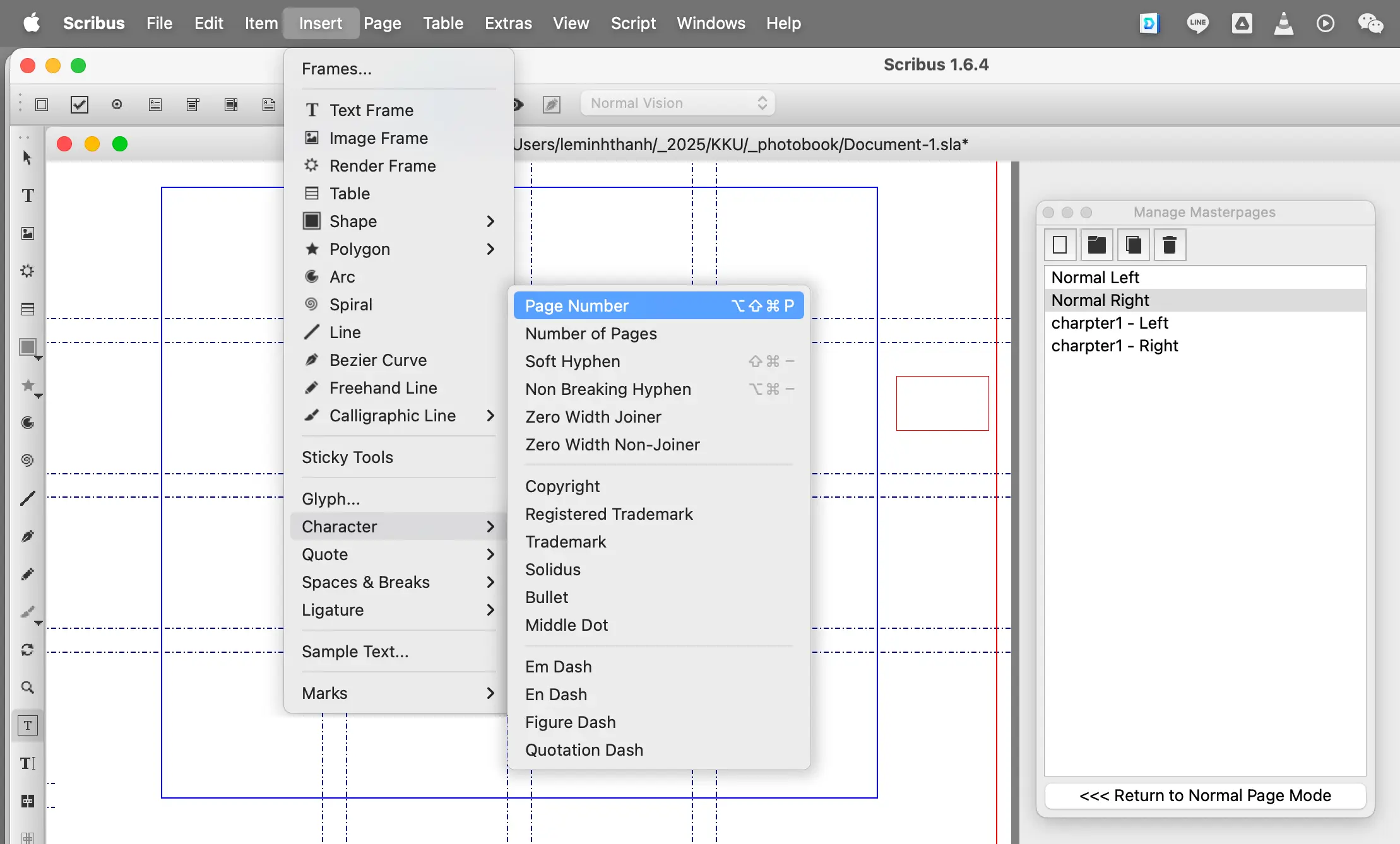 Như các phần mêm layout khác, Scribus sẽ chèn số trang trong master page
