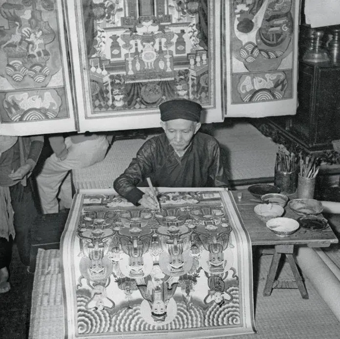 Nghệ nhân tranh Hàng Trống tô màu lên bức tranh "Tứ Phủ", Hà Nội năm 1953.