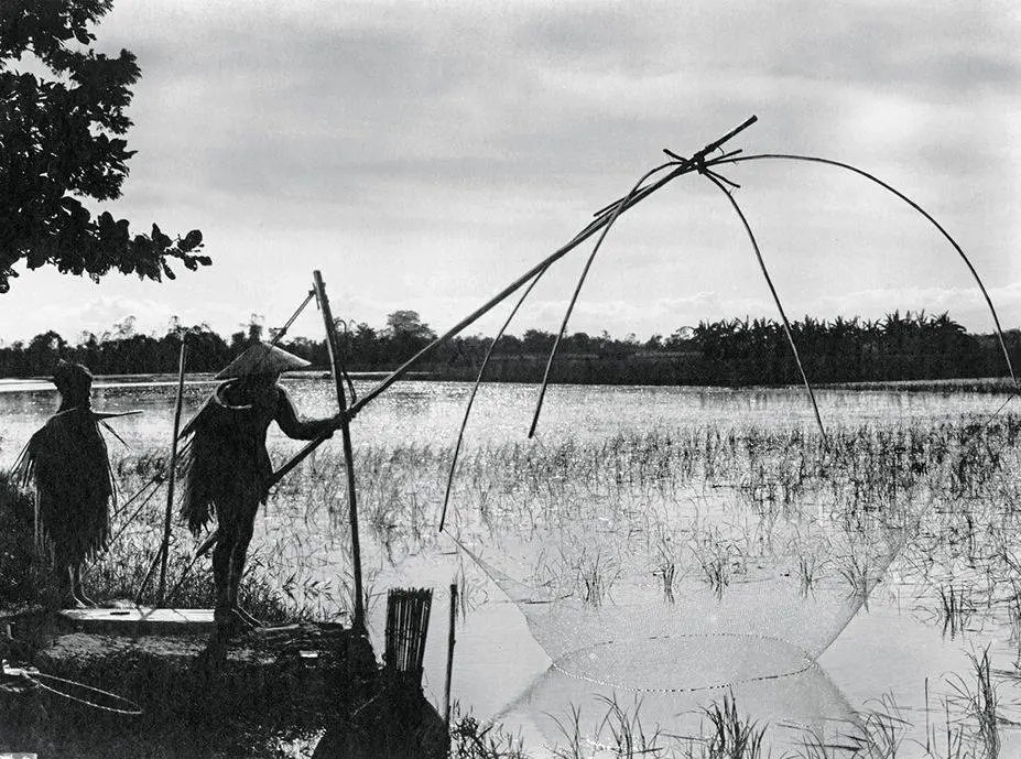 Người nông dân mặc áo tơi cất vó, năm 1925.