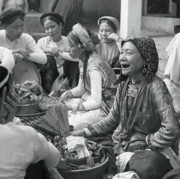 Các bà đồng xem bói trong sân Đền Ghềnh, Hà Nội năm 1953.